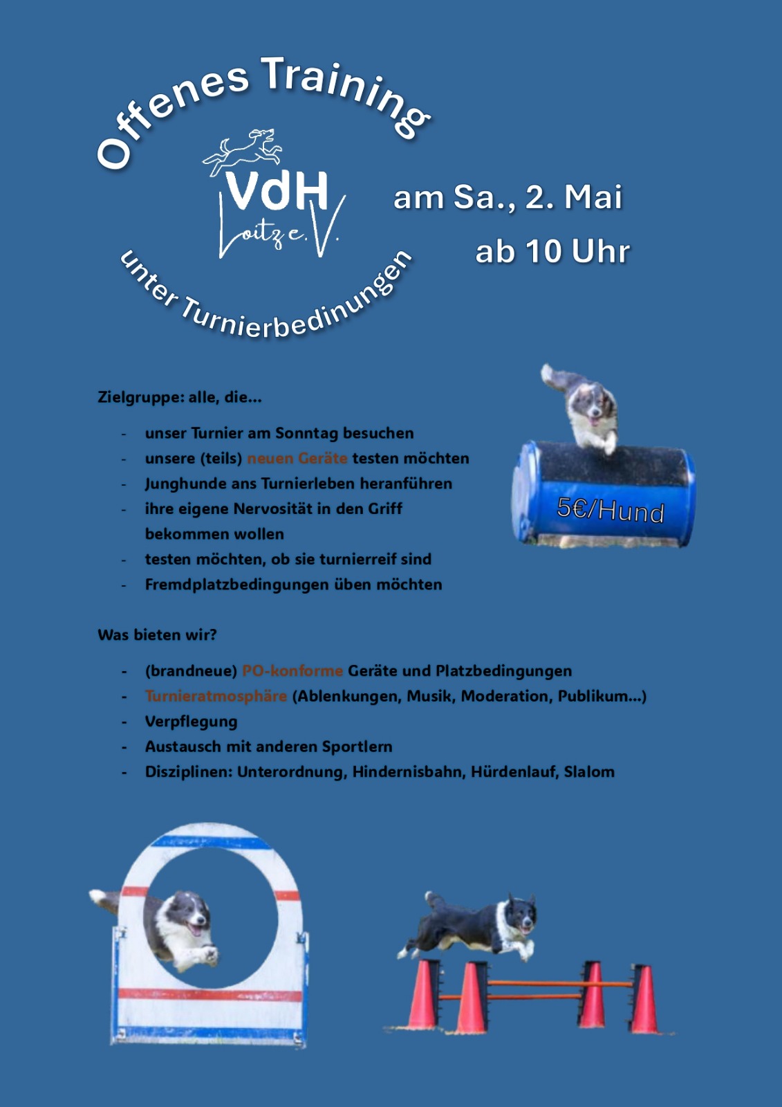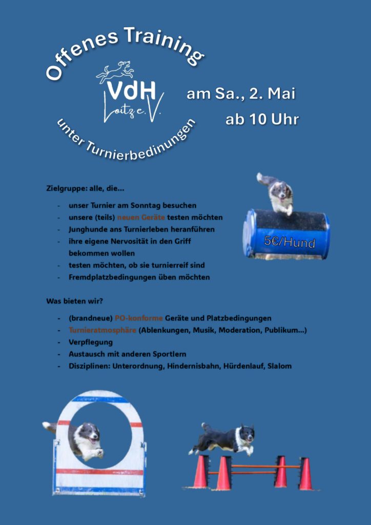 | 25.-26. April | kleines Agility Turnier (Hundeplatz) |